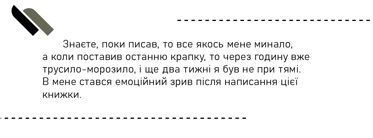 Через дві години я вийшов із балкона — уже без пачки цигарок, зате з готовим сюжетом. Знаєте, це як фільм подивився — лишилось тільки записати. Але на це пішло дев’ять місяців. На четвертому — узагалі кинув, але потім продовжив, бо на мене тиснули полтавські волонтери, яким я надсилав фрагменти. А з волонтерами сперечатись — собі дорожче. Дописав. Але дуже болісно пропустив через себе.