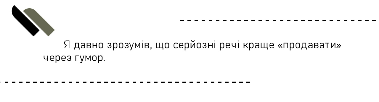 А на фронті без гумору було б зовсім кепсько. Одні й ті ж події — спершу страшні, а потім згадуються як анекдоти. От, наприклад, вибухова хвиля тебе жбурнула — ну, не до сміху в той момент, правда? А потім згадуєш — як я художньо летів! І з побратимами сміємося.