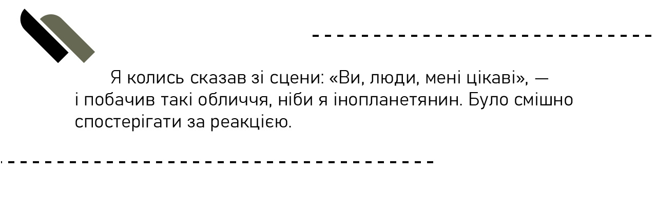 Я коли цю різницю усвідомив, то подумав: та я з дитинства драматург! (сміється — авт). Так мені це сподобалося, що я сів і написав. Майже без правок обійшлося. Кілька разів приїжджав у театр, знайомився з акторами й трохи адаптував текст під них. Це правильно. Коли конкретно під акторів щось пишеш — звучить по-іншому. Це — класно. Мені дуже сподобався цей досвід.