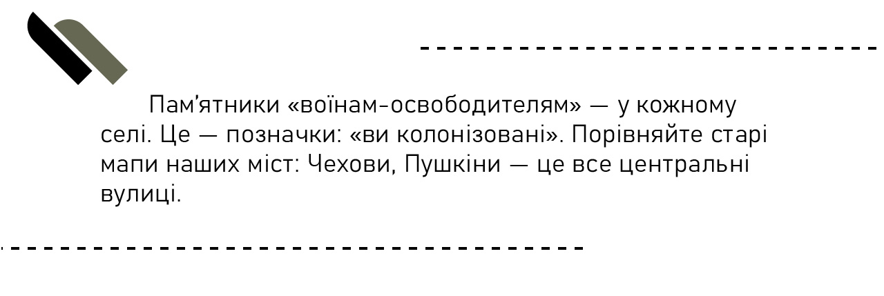 — Мене дивує, чому ми самі досі не сприймаємо це серйозно. Чому, наприклад, перейменування вулиць у нас досі викликає обурення? А для них це першочергово: приходять і відразу — вулиця Леніна, вулиця Гагаріна, руский язик. Це ж символи колонізації.