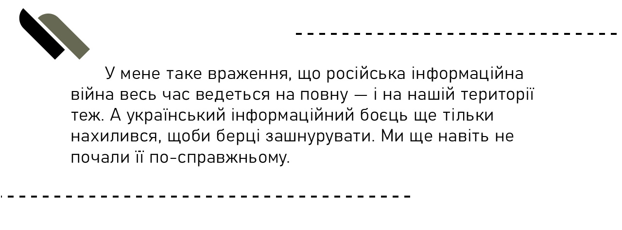 — Вони почали інформаційну війну значно раніше, ніж АТО і повномасштабне вторгнення. Я пам’ятаю, як приїхав на першу ротацію у Волноваху. Там був телевізор. Наш канал — «1+1» чи ще якийсь — нічого такого, що надихає не показував. А у них кілька каналів одразу: шедеври світового кіно, а знизу — стрічка новин. І от запам’яталась така: «Уряд ДНР підвищив пенсію ветеранам Другої світової на 500 рублів». Це тоді — десь 120 гривень. І скільки тих ветеранів? Для їхнього бюджету це дрібниці. Але галасу — купа. Вони створили ефект турботи.