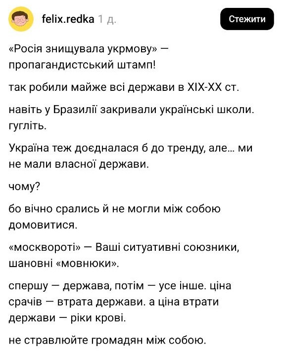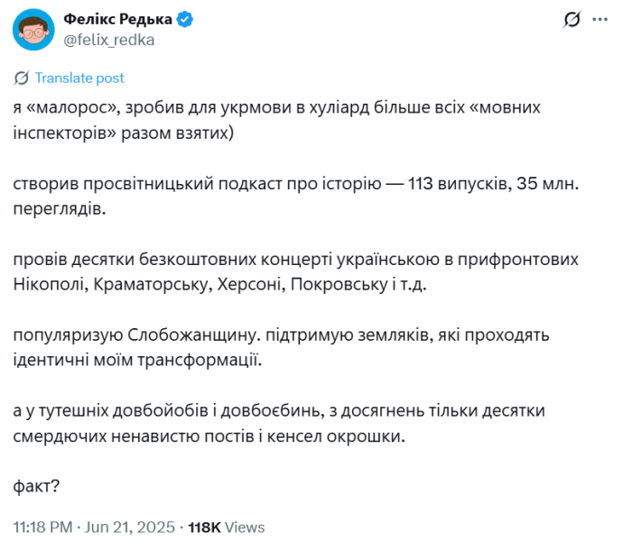 Зазначимо, що Фелікс Редька вже потрапляв у скандали щодо мовного питання в Україні: у 2024 році він закликав перестати чіплятися до громадян, які продовжують у побуті розмовляти російською мовою і не засуджувати батьків, які говорять з дітьми російською мовою, а у 2023 — жартував на стендапі про те, скільки бомб має впасти на мешканців прифронтових областей, щоб вони перестали говорити російською.