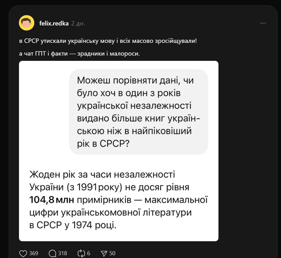 Відповідь Феліксу Редьці про наклади книжок в СРСР не від чату GPT, а від Читомо