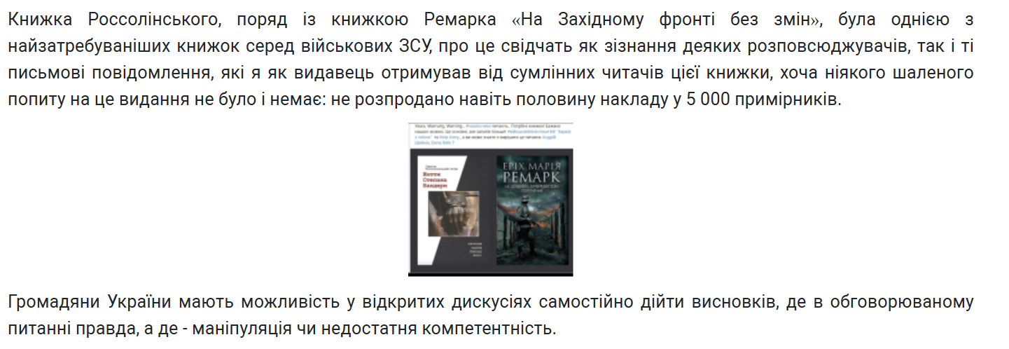 «Я готую до видання біографію Степана Бандери авторства Россолінського-Лібе, презентацію якої свого часу зірвали наші свободівці. Це книга німецького вченого, стипендіата Фонду Генріха Бьолля, який багато років працював в архівах і написав дуже ґрунтовне дослідження. Книга, серед іншого, видана Колумбійським університетом США, тож у науковому потенціалі її не доводиться сумніватися. Щоправда, у цьому дослідженні є дефініції, які в Україні не дуже «до вподоби», бо вони, на жаль, збігаються з деякими дефініціями, що лунають із ворожого берега в Росії. Ворожий берег, як у випадку з гітлерівською пропагандою про Сталіна, не завжди городить вигадки. На жаль, усе трохи складніше», — говорив він в інтерв’ю виданню «Детектор медіа» 2018 року .