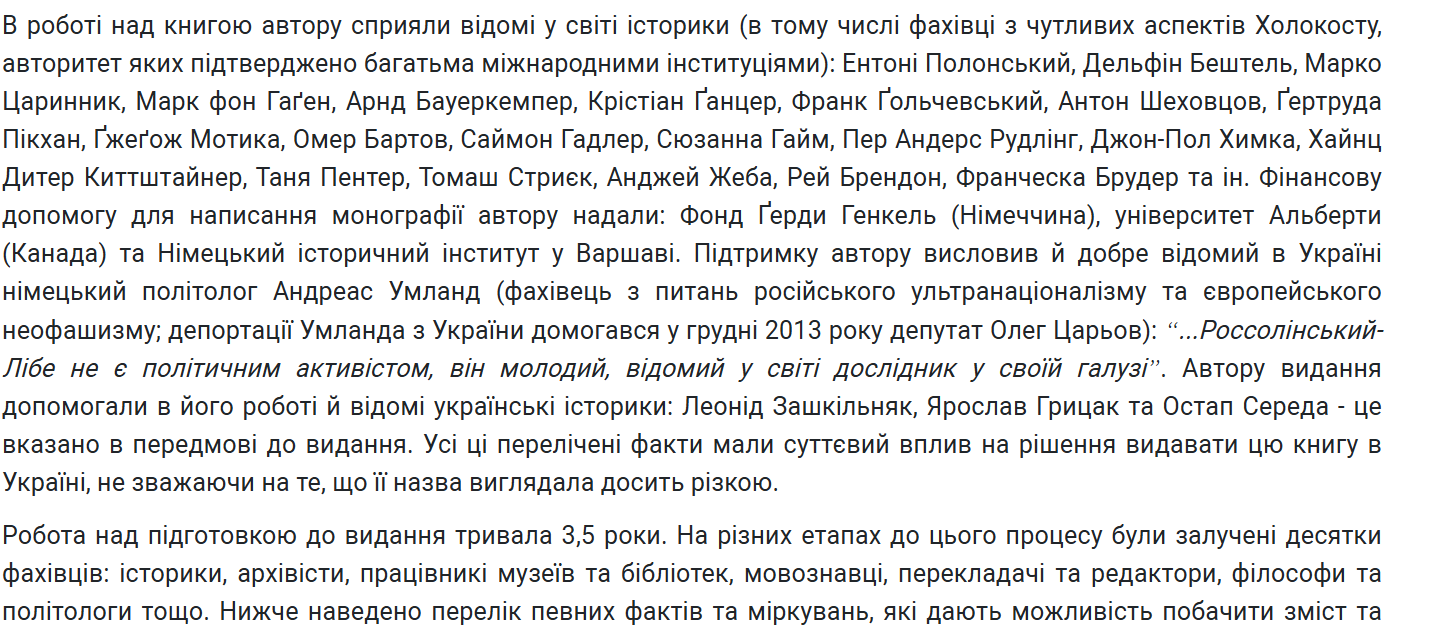 Окрім цього, мережа надала цитати відомих істориків, які позитивно оцінили книжку як вагомий внесок у розуміння складних аспектів української історії. Зокрема, у мережі послалися на думки Тімоті Снайдера, Омера Бартова та інших.