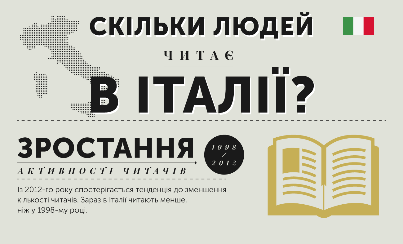 Зростання читацької активності італійців припадає на 1998-2012 роки, коли ринок також зростав, а вже з 2012-го спостерігається тенденція до зменшення чисельності. І зараз в Італії читають навіть менше, ніж у 1998 році. Можна припустити, що це трапилось через економічну кризу. Але криза не так вплинула на інші країни, як на Італію.