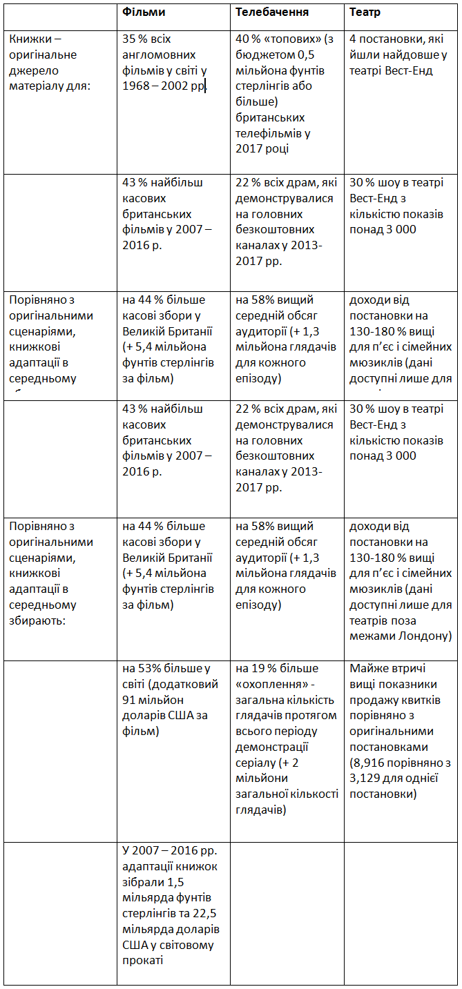 Книжки також популярне джерело високобюджетних серіалів. 40 відсотків з 35-ти топових серіалів, які зняли у Великій Британії протягом періоду з січня по вересень 2017 року, ґрунтувалися на книжках. Лише 26 відсотків засновано на оригінальному матеріалі, а решта – на реальних подіях, або були адаптацією іншого серіалу чи фільму.
