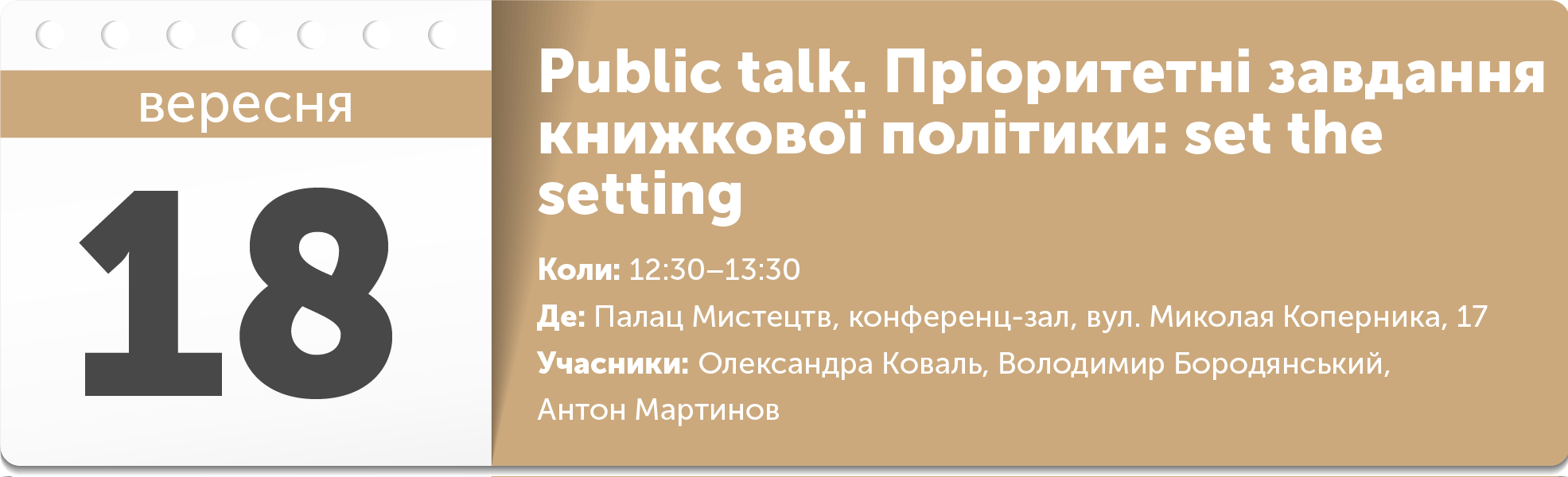 Про пріоритетні завдання книжкової політики розповідатимуть міністр культури, молоді і спорту Володимир Бородянський, координатор напрямку «Книги та видавнича індустрія» при Міністерстві культури, молоді і спорту Антон Мартинов, директорка Українського інституту книги Олександра Коваль.