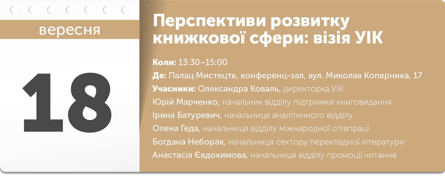 Український інститут книги розкаже про те, на що їх наштовхнули результати останніх досліджень, якою є ситуація на ринку і яким чином це вплине на нові програми Інституту. До участі запрошуються видавці та фахова аудиторія. Якими методами Інститут планує просувати читання, як відбуватиметься промоція української літератури за кордоном, яке буде майбутнє поповнення фондів бібліотек, чи плануються дослідження ринку та фахові програми для представників книжкової сфери. Український інститут запрошує до співпраці у масштабуванні проєктів.