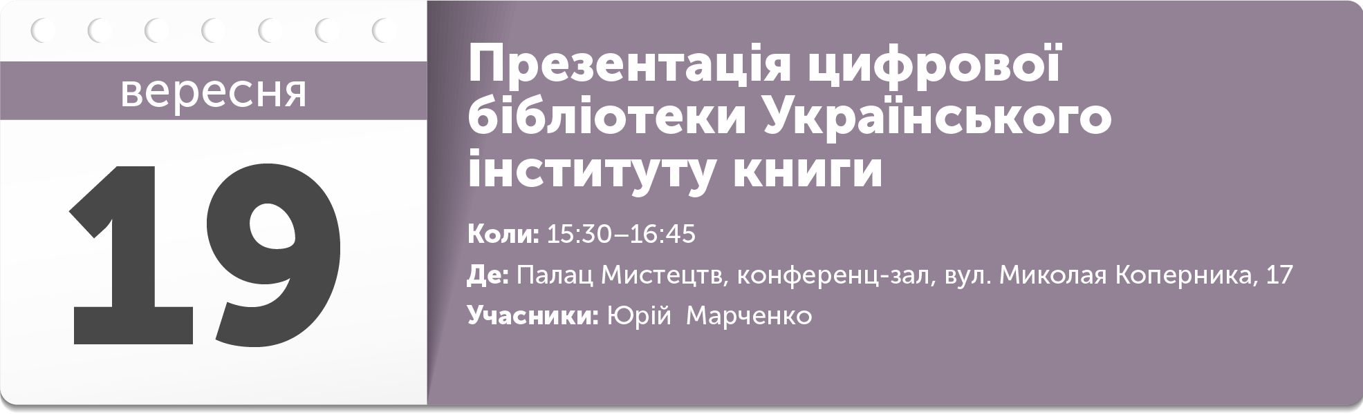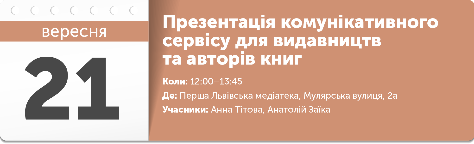 Презентація інтернет-ресурсу літературного агентства «Видавнича біржа». Під час події демонструватимуть сторінки ресурсу на великому моніторі з поясненням можливостей і переваг для видавництв та для авторів.
