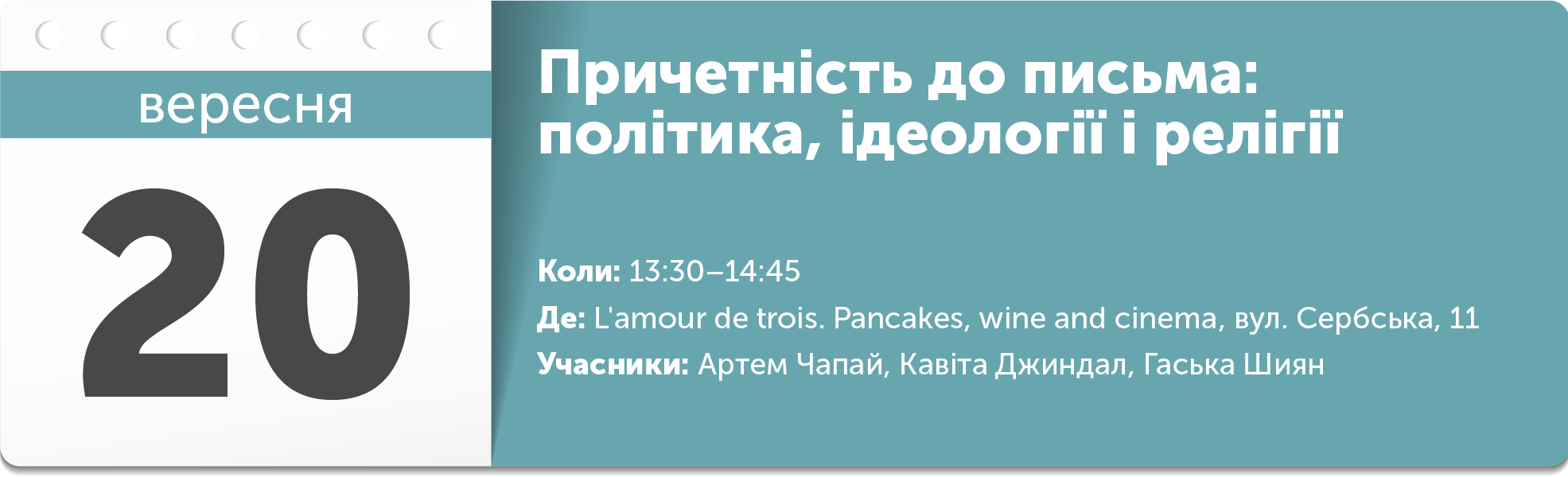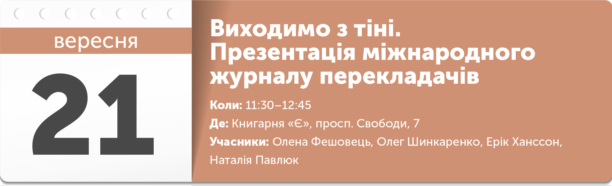 Презентація авторського проєкту Наталії Павлюк — міжнародного онлайн-видання «Тіні. Міжнародний журнал перекладачів», який виходить українською та англійською мовами. На подію запрошені герої журналу для неформального обговорення різних видів перекладу, життя і творчості перекладачів, а також минулого, теперішнього та майбутнього професії.