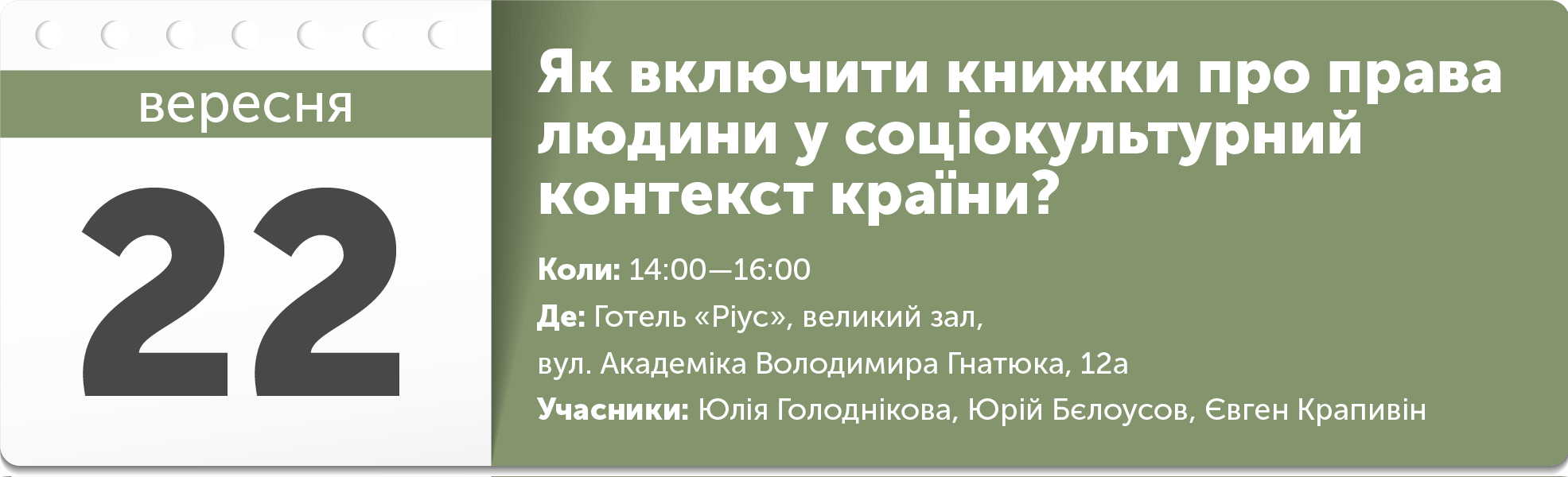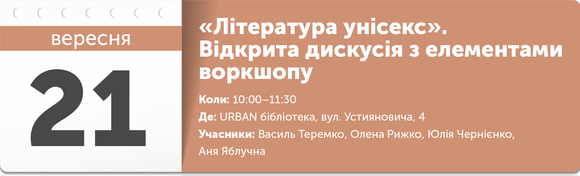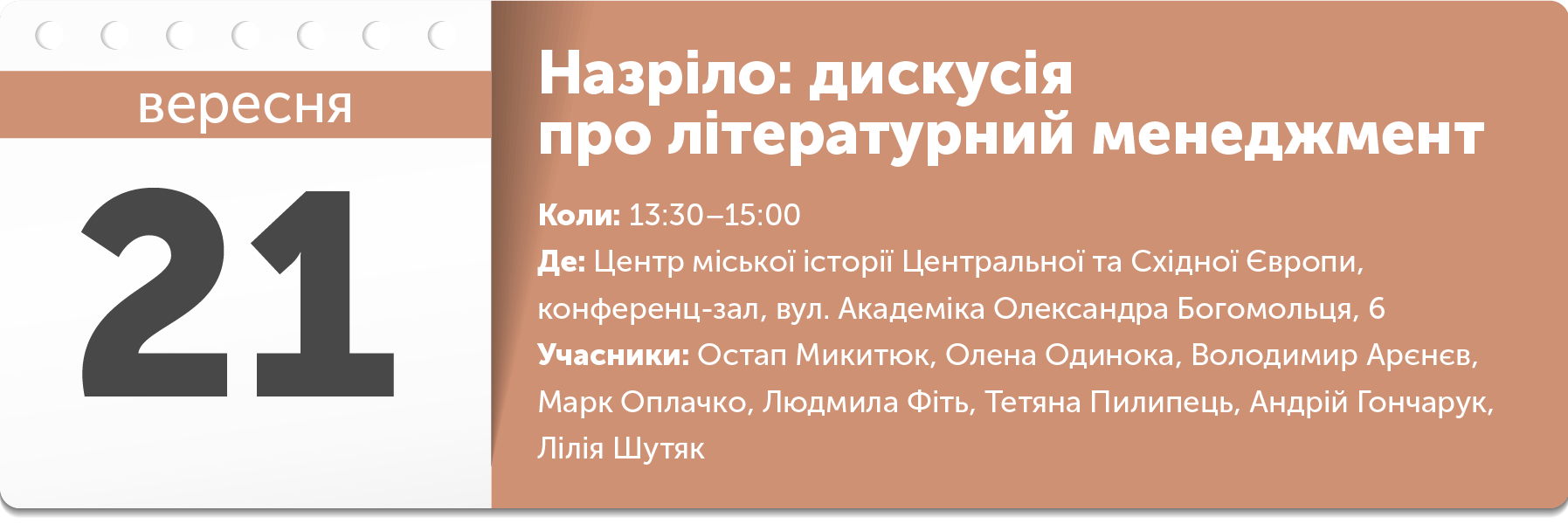 На дискусії обговорять глобальну потребу в літературних агентах для просування творчості сучасних українських авторів як в Україні, так і за її межами, а також підводні камені, перспективи, зрадоньки й переможеньки.