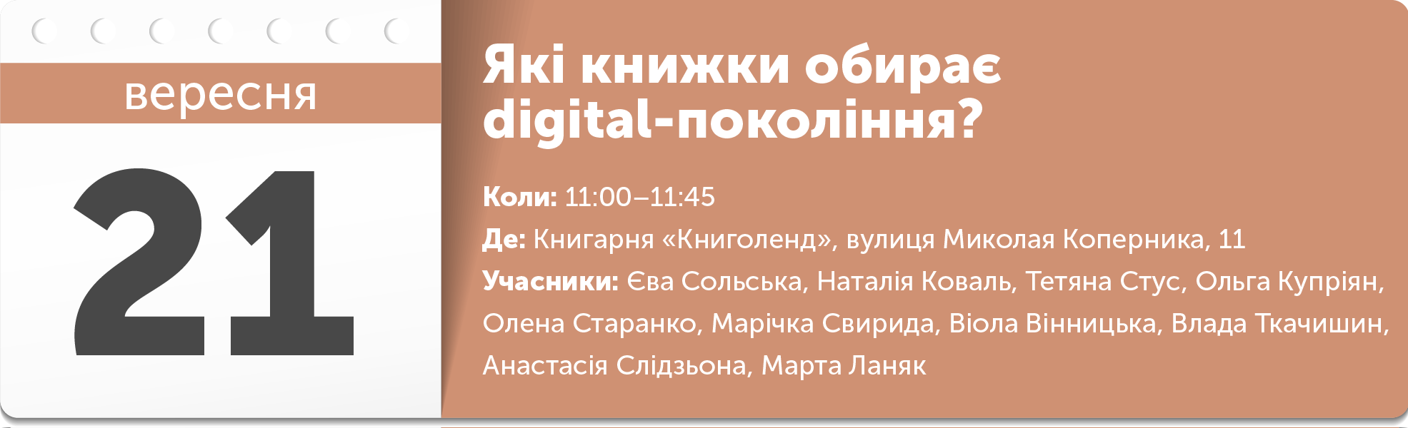 Дорослі «доганяються» підлітковими книгами, щоб порівняти досвіди й знайти підказки, а тінейджери — щоб розрулити з думками й почуттями. Якою ж має бути сучасна книжка про і для підлітків, щоб догодити всім? Як письменнику, видавництву й бібліотекарю знайти підхід до читача-підлітка, щоб відволікти його від гаджета й розкрутити на відвертий діалог? Відповіді дасть команда видавництва й відомі підліткові письменниці. В ігровій формі вони поділяться успішними й провальними кейсами в роботі з читачами-тінейджерами.
