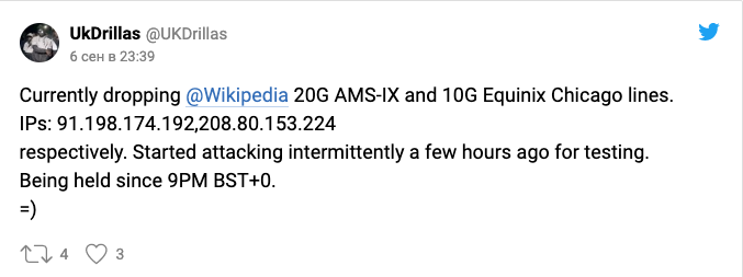 «Просто зараз атакуємо лінії @Wikipedia 20G AMS-IX і 10G Equinix Chicago (Сервери Вікіпедії) IP-адреси: 91.198.174.192,208.80.153.224 відповідно. Кілька годин тому почали тестову атаку. Проводимо з 9 вечора BST+0», – йшлося у повідомленні.